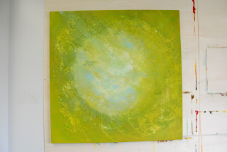 Jetzt nimmst du einen feuchten Schwamm und tupfst überall dort wo die „Rinnsale“, die Tropfen sind, die oberste Farbe weg. Denn dort wo es feucht ist, hat sich die oberste Farbe gelöst. Wenn du sie mit dem Schwamm wegtupfst, scheint die untere leuchtende Farbe durch…! Hier darfst du einfach etwas herumexperimentieren – du wirst sehen, es macht einen riesen Spass!